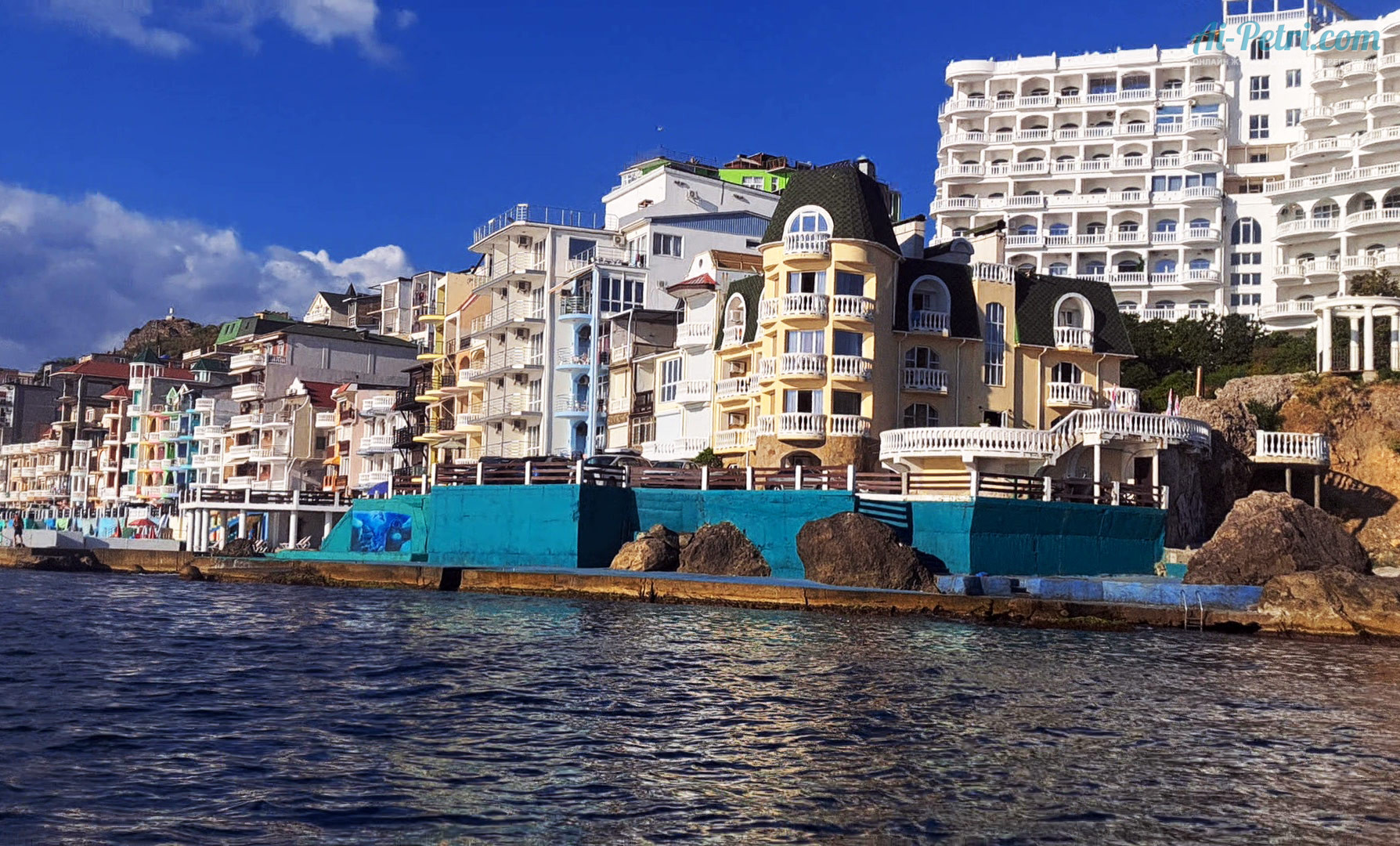 Вот так Каменный Хаос видится с воды, практически даже не распознаваемый на фоне выросших над ним громадных высотных «НОВОДЕЛОВ», черт знает каким образом втиснувшихся в этот чудный крымский уголок..