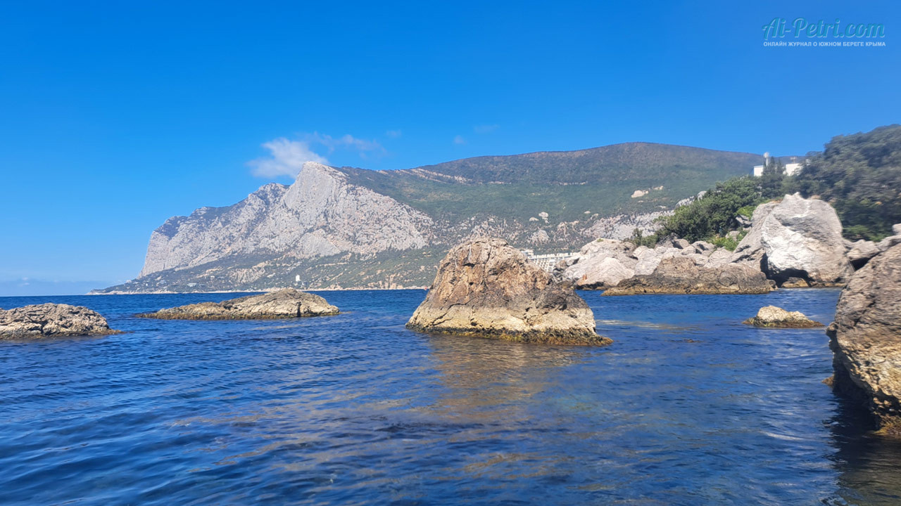 Но сейчас речь идет о пляже, расположенном на противоположной стороне бухте, ближе к мысу Сарыч. Это пляж пансионата Изумруд, удивительно гармонично вписавшегося в береговую линию между морем и Южнобережным шоссе перед самым Ласпинским перевалом и прямо под вершиной Ильяс-Кая
